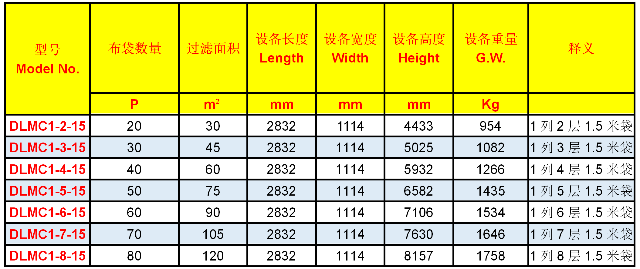 8、以DLMC4-8-15为例,表示4个8层的模块,采用1.5米滤袋,总共320袋。体积为2832*4114*8157MM。