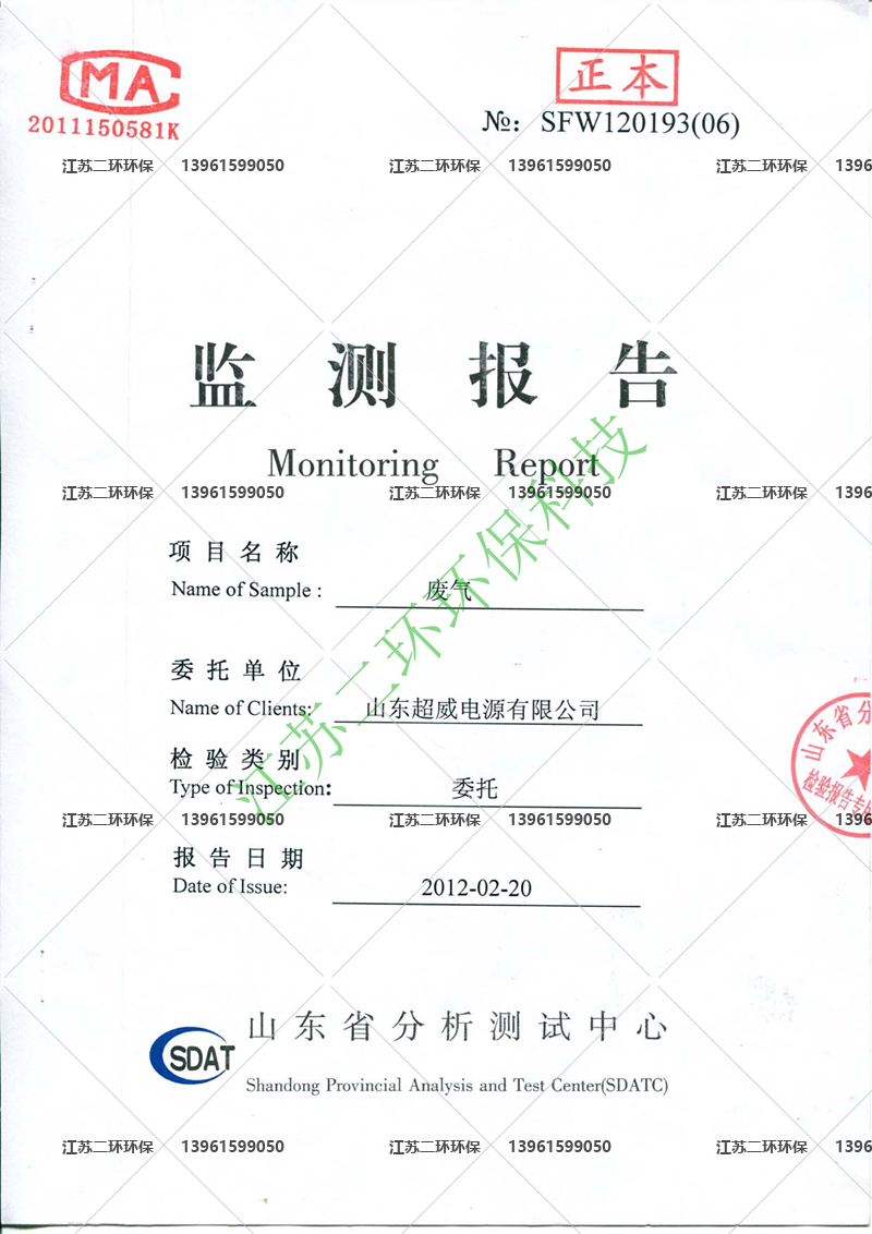 6、排放浓度≦0.1毫克/立方米型:江苏永达电源有限公司(股票代码:超威动力HK00951)出厂前检测(下图)