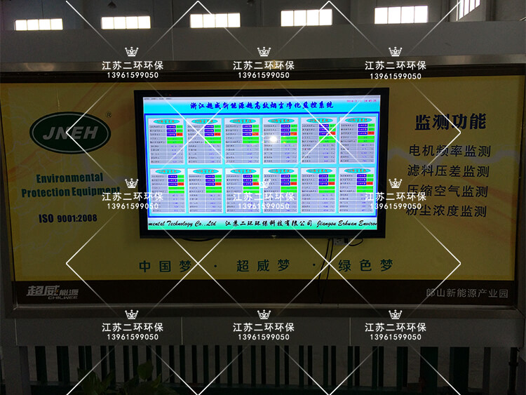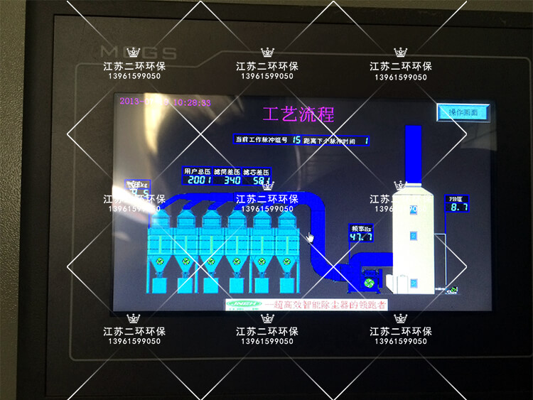 12、触摸屏+PLC的智能电柜,配合在线压缩空气监测仪、风压监测仪、压差监测仪、粉尘在线浓度监测仪构成了数字化信息交互的智能除尘, 出现故障,声光报警。