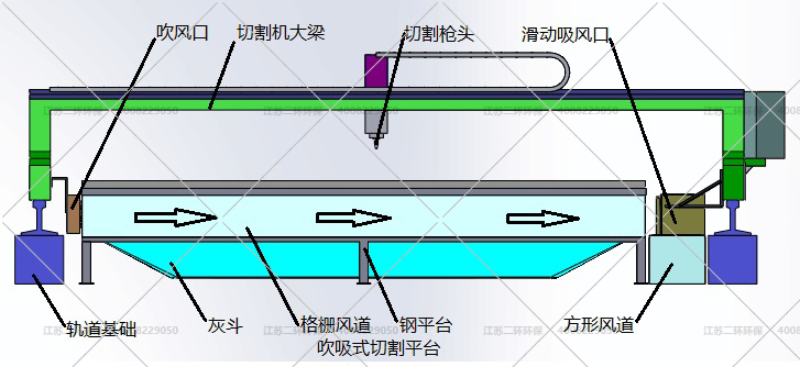 4、移动的行程导轨一侧安装抽风管道,并有相应的风门调节,在哪个点切割时,对应该点的风阀打开,通过管道连接花季传媒软件下载黄色版抽走烟尘。